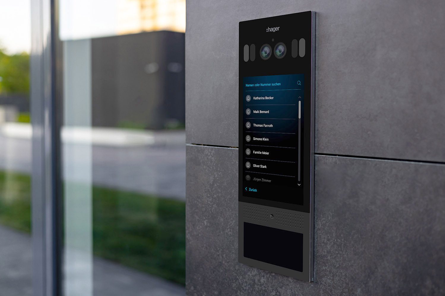 Entrance doorbell in a multi-apartment building, with a video surveillance camera, on a dark wall